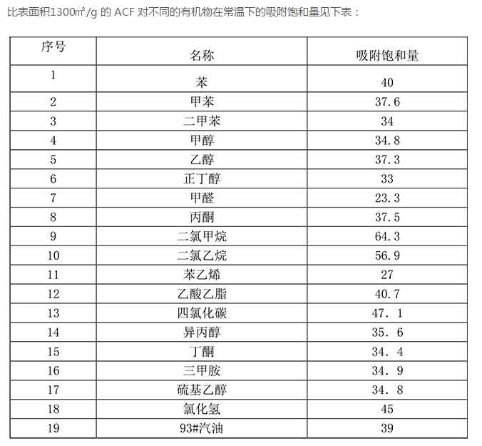 活性碳纖維對有機氣體及惡臭物質(如正丁基硫醇等)的吸附量比粒狀活性碳( GAC )大十倍至幾十倍。對無機氣體也有較好的吸附能力。對水溶液中的無機物、染料、有機物及貴金屬的吸附量比 GAC 高 5 — 6 倍。對微生物及細菌也有很好的吸附能力(如對大腸桿菌的吸附率可達 94 — 99% )。對低濃度吸附質的吸附能力特別優良。如對于吸附質的濃度在幾 ppm 級時仍可保持很好的吸附量,而 GAC 等吸附材料往往在幾十ppm濃度時才有良好的吸附能力。